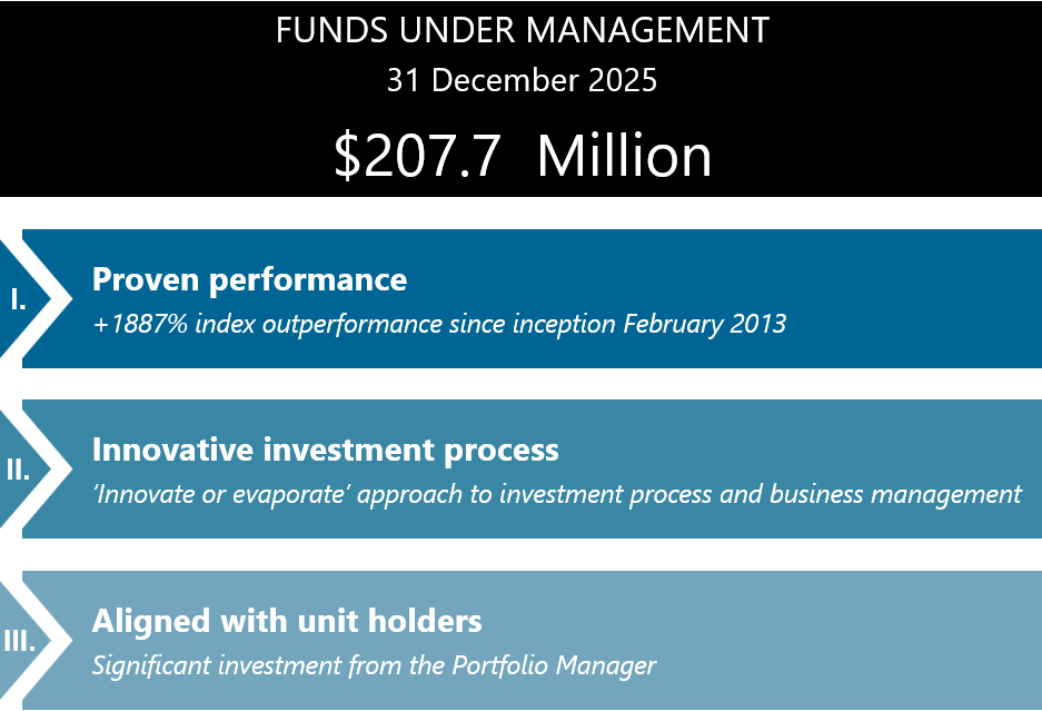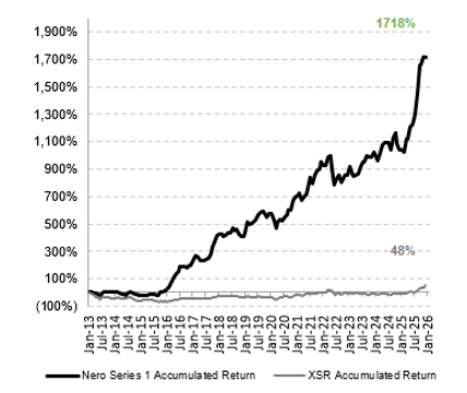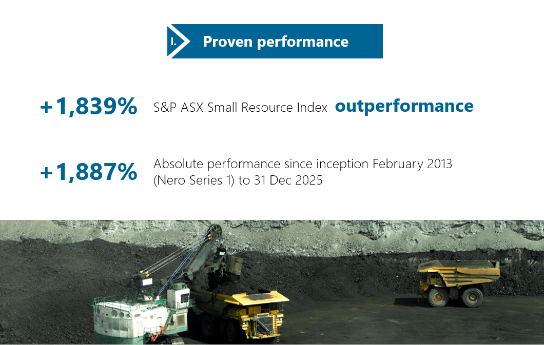 AUSTRALIA'S PREMIER EMERGING SMALL RESOURCE FUND December 31, 2025 by Russell Delroy The fund has now reached maximum subscriptions and will no longer be accepting new capital Significant market outperformance and solid absolute performance in the context of poor market conditions. Nero has substantially outperformed both the ASX Small Resources Index and relevant global resource fund peers since inception. Outperformance has been driven by disciplined commodity exposure selection, identification of deep value and substantial company due diligence. Proprietary investment tool utilised to store, collaborate and test knowledge - we call this our Knowledge Management System. An innovative translation of country risk to an additional discount rate delivers more conservative and appropriate valuations. Our proprietary geological database allows for early analysis of exploration project characteristics against globally significant deposit attributes. Rigorous primary investment model ensures investments are made in the most compelling opportunities. Fee structure that encourages performance rather than building FUM ensures client outcomes drive decision making.